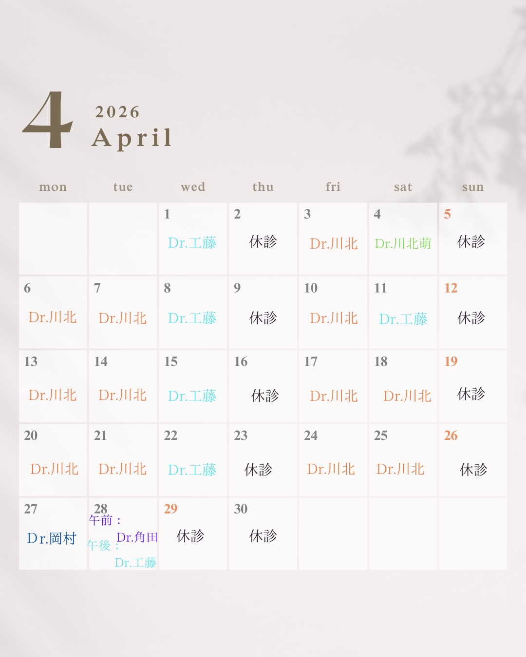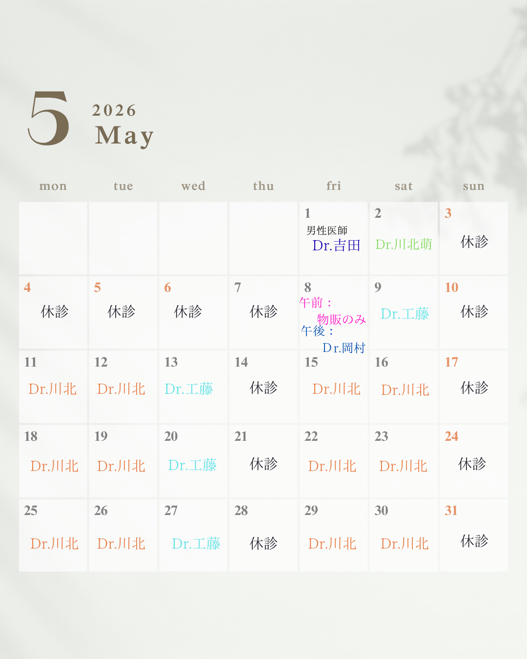 診察時間 / 月~土曜日 10:00〜13:00、14:00〜17:30(close)